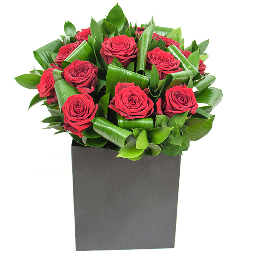 Our bouquet combines the exquisite beauty of red roses, with the lush greenery of aspidistra leaves and ruscus, creating a unique and stylish arrangement that enhances any home decor.